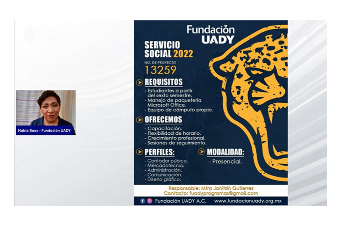 Del 27 de junio al 1 de julio, los responsables de cada instancia receptora presentarán sus proyectos a través de las páginas de Facebook oficial de la UADY y de la del Programa Institucional de Servicio Social (Proiss) con el fin de dar a conocer a los jóvenes las diversas opciones que tienen para poder cumplir con este requisito académico.