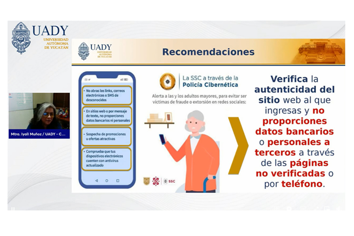 Cada día, en promedio, tres adultos mayores reportan incidentes cibernéticos como fraude, acoso, extorsión y suplantación de identidad, destacó la responsable de Comunicación Digital, Audiovisual e Identidad de la UADY, Iyali Muñoz Barreiro, durante la conferencia «Ciberseguridad y personas mayores».