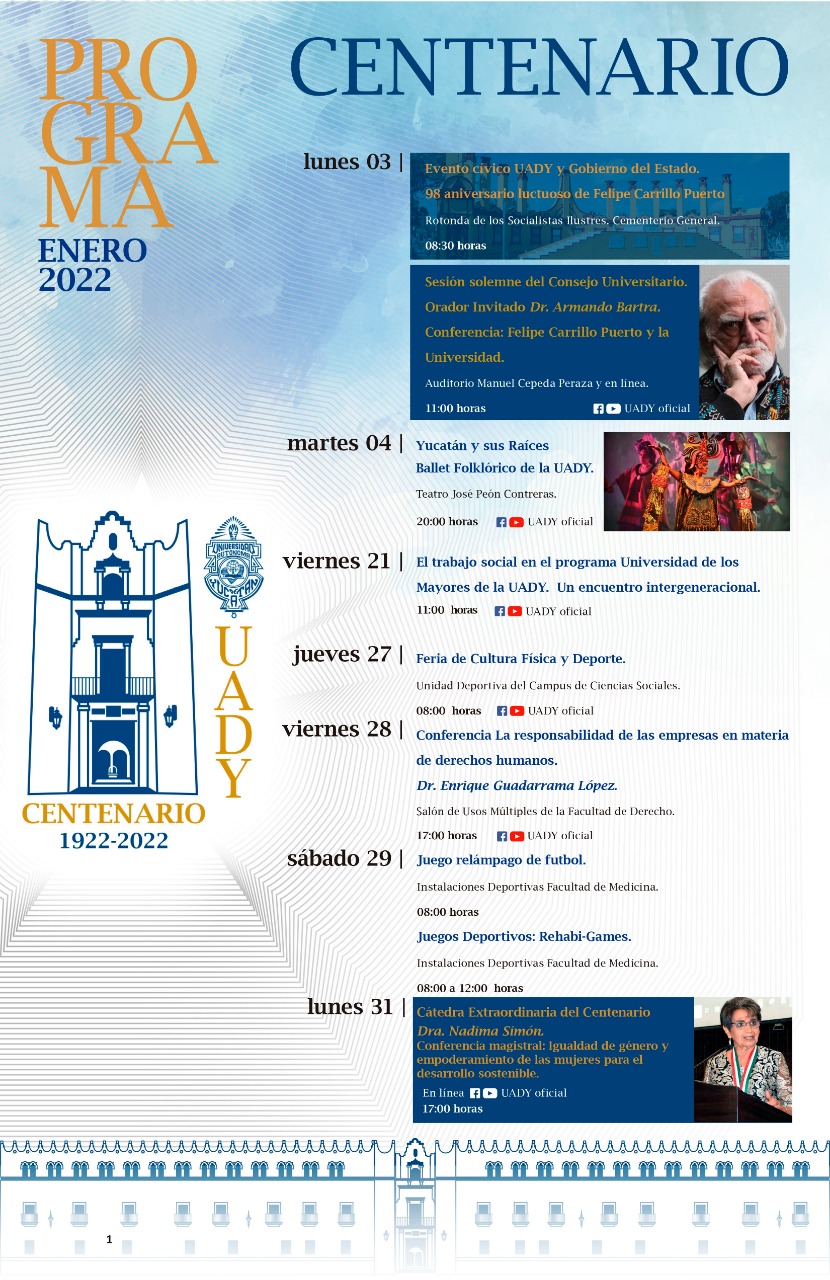 Al cumplirse el primer centenario de su fundación, la Universidad Autónoma de Yucatán (UADY) promoverá una serie de actividades académicas, artísticas y deportivas, centradas en motivar la reflexión sobre las contribuciones, pasadas y presentes, de la gran comunidad universitaria al desarrollo económico, social y cultural de nuestro estado y país.