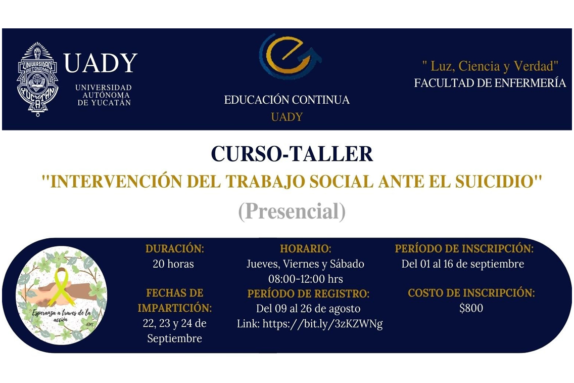 Los orígenes y definición del suicidio, las estrategias de prevención y cómo participan las y los trabajadores sociales cuando se consuma este acto, son las vertientes que se estudiarán en el curso-taller “Intervención del Trabajo Social ante el suicidio”, a impartirse en la Facultad de Enfermería de la Universidad Autónoma de Yucatán (UADY).