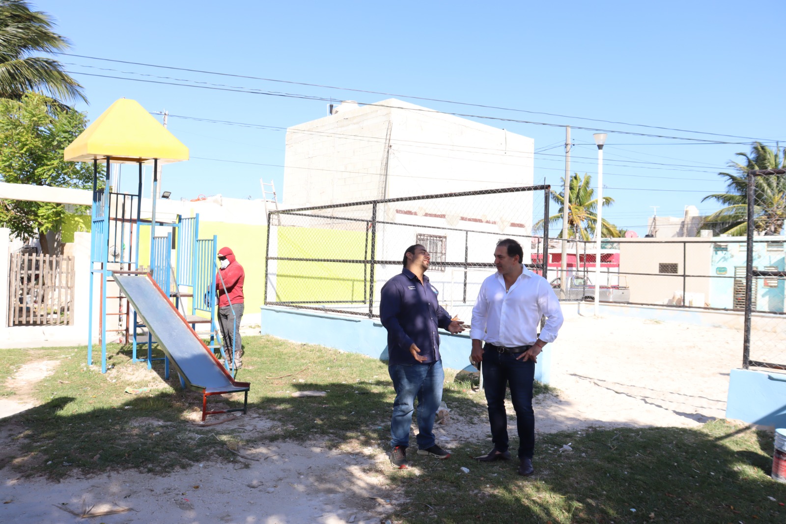 Para tal fin, lo acompañó el director de Servicios Públicos y Ecología, Canan Góngora Ortegón, quien le explicó que se rehabilitó el módulo de juego infantil, se hizo el remozamiento de 70 metros lineales del murete del área de fútbol, además se sustituyeron bancas dañadas por unas con capacidad de 3 módulos cada una.