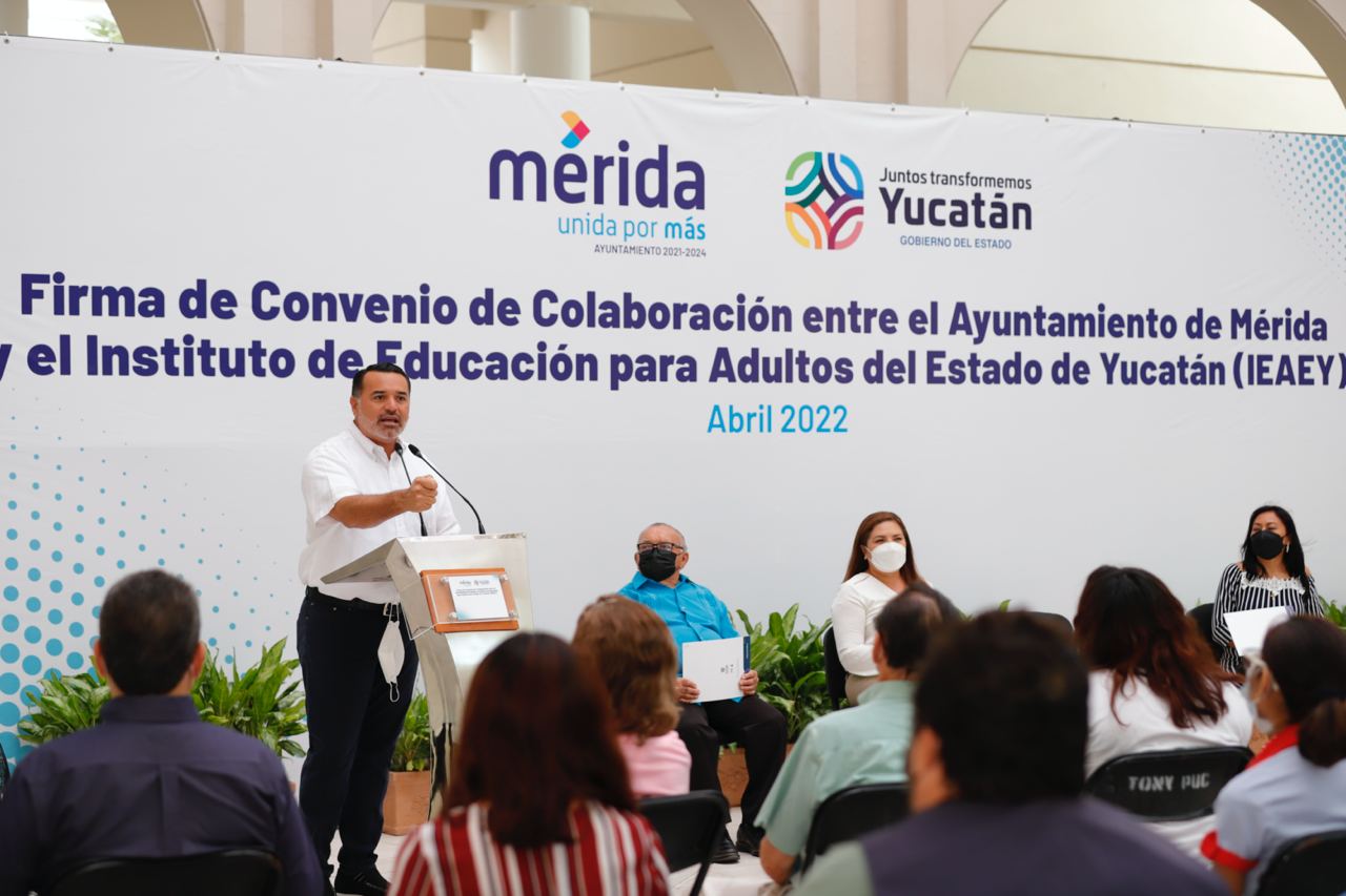 Para cumplir con nuestro compromiso de sentar las bases para que el Municipio cuente con un desarrollo armónico e inclusivo, el Ayuntamiento de Mérida firmó un convenio con el Instituto de Educación para Adultos del Estado de Yucatán (IEAEY) para que las y los habitantes continúen con su formación académica y profesional, aseguró el Alcalde, Renán Barrera Concha.