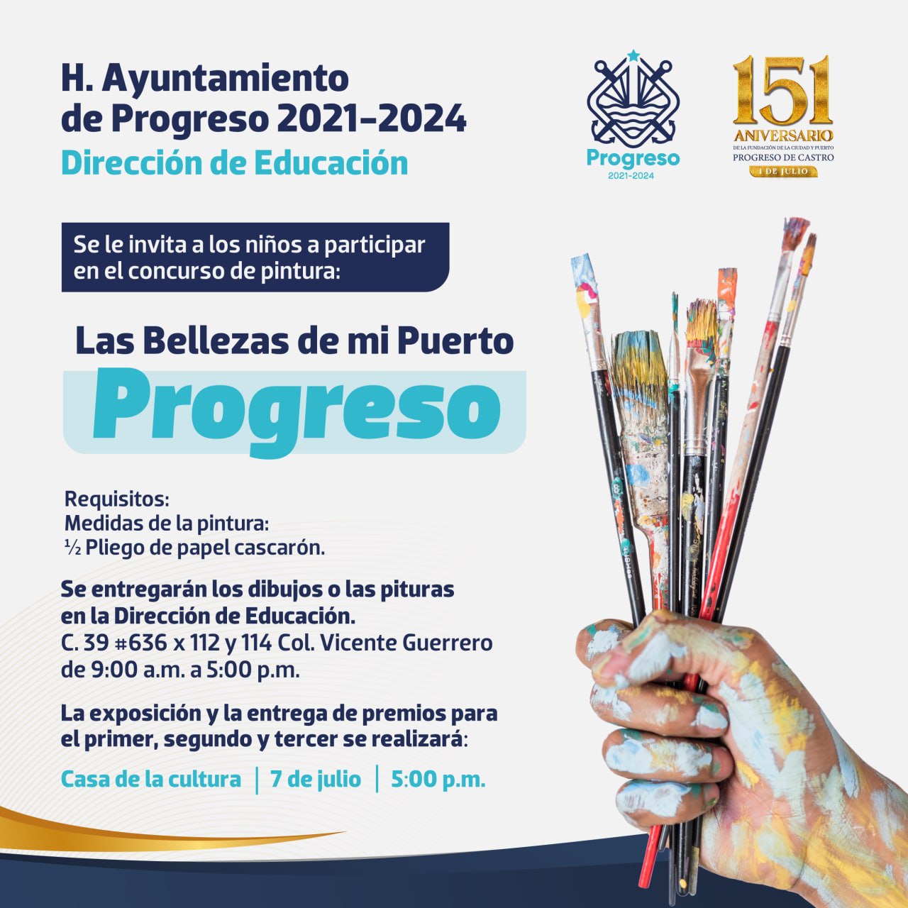 En el marco del 151 Aniversario de la fundación de Progreso de Castro, el H. Ayuntamiento que preside el alcalde Julián Zacarias Curi, invita a todos los niños del municipio y sus comisarías, a participar en el concurso de pintura “Las Bellezas de mi Puerto”.
