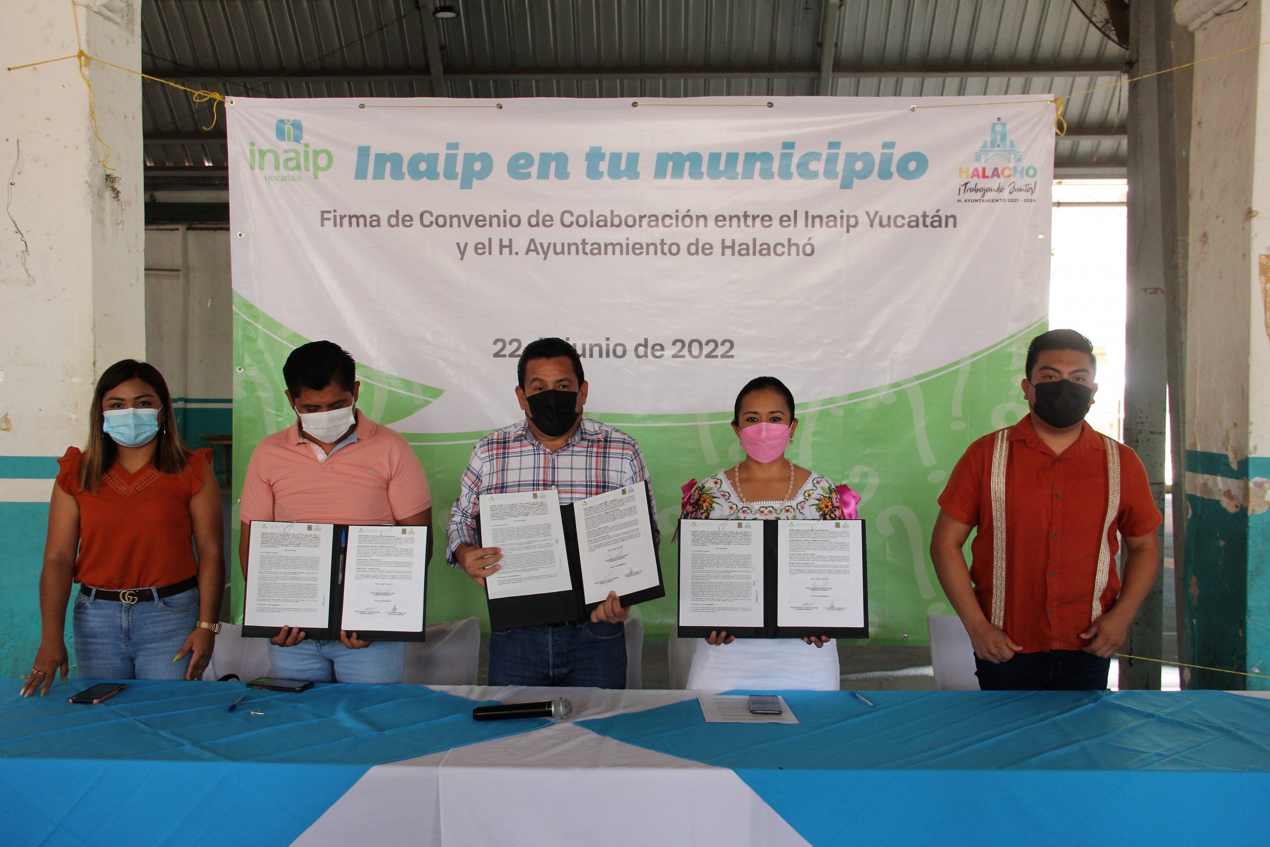 En el evento el Inaip Yucatán firmó un convenio de colaboración con el Ayuntamiento, representado por su Alcalde Rodolfo Castilló Huchim y su Secretario Municipal Dagoberto Caamal Can, acompañados del titular de la Unidad de Transparencia César Canul Hau y la Síndico Municipal