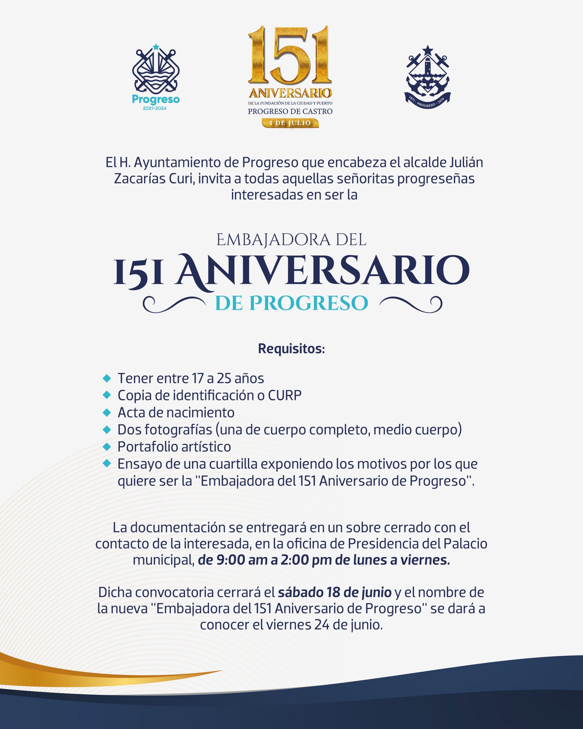 El H. Ayuntamiento de Progreso que encabeza el alcalde Julián Zacarías Curi, invita a todas aquellas jóvenes progreseñas interesadas en ser la “Embajadora del 151 Aniversario de Progreso».