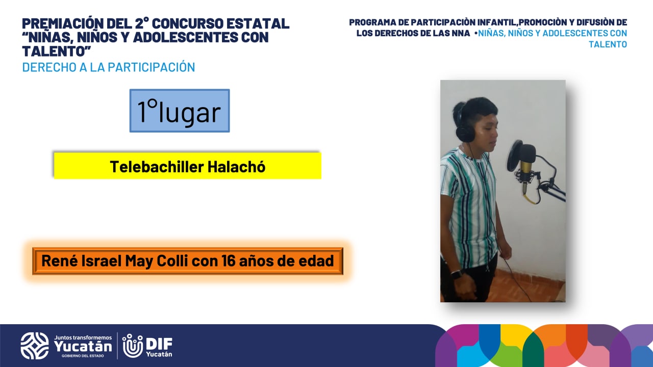 Resultaron ganadores, en primer lugar, René Israel May Collí, con 16 años de edad, radicado en Halachó; segundo, Valeria Abigail Azueta Chan, con 14, de Peto, y Julia Jazmín Castillo Acosta, 17, de Dzilam González. A nombre de la Directora General del DIF, María Teresa Boehm Calero, la Subdirectora Operativa, Mariana Villamil Rodríguez, reconoció el talento de todas y todos los participantes.