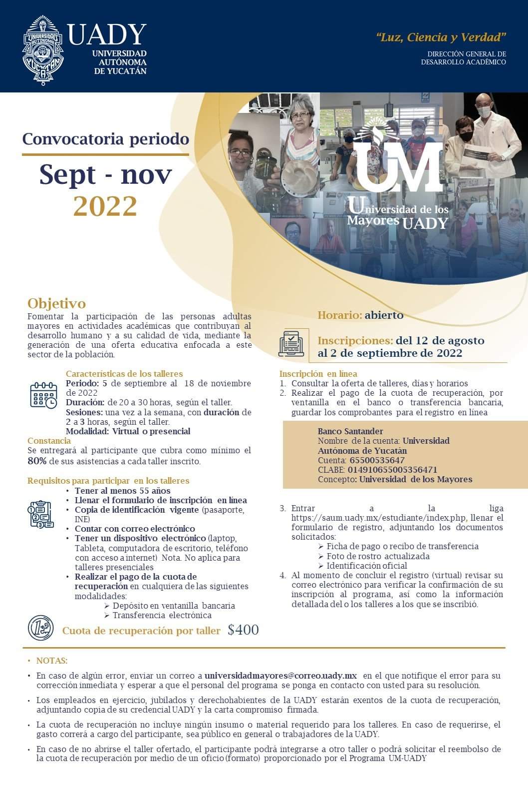 Con una oferta de más de 25 talleres que abarcan temas sobre ejercicio físico, actividades lúdicas, nutrición, música y arte, la Universidad de los Mayores (UM), programa de la Universidad Autónoma de Yucatán (UADY), abrió su convocatoria correspondiente al periodo septiembre-noviembre de 2022.