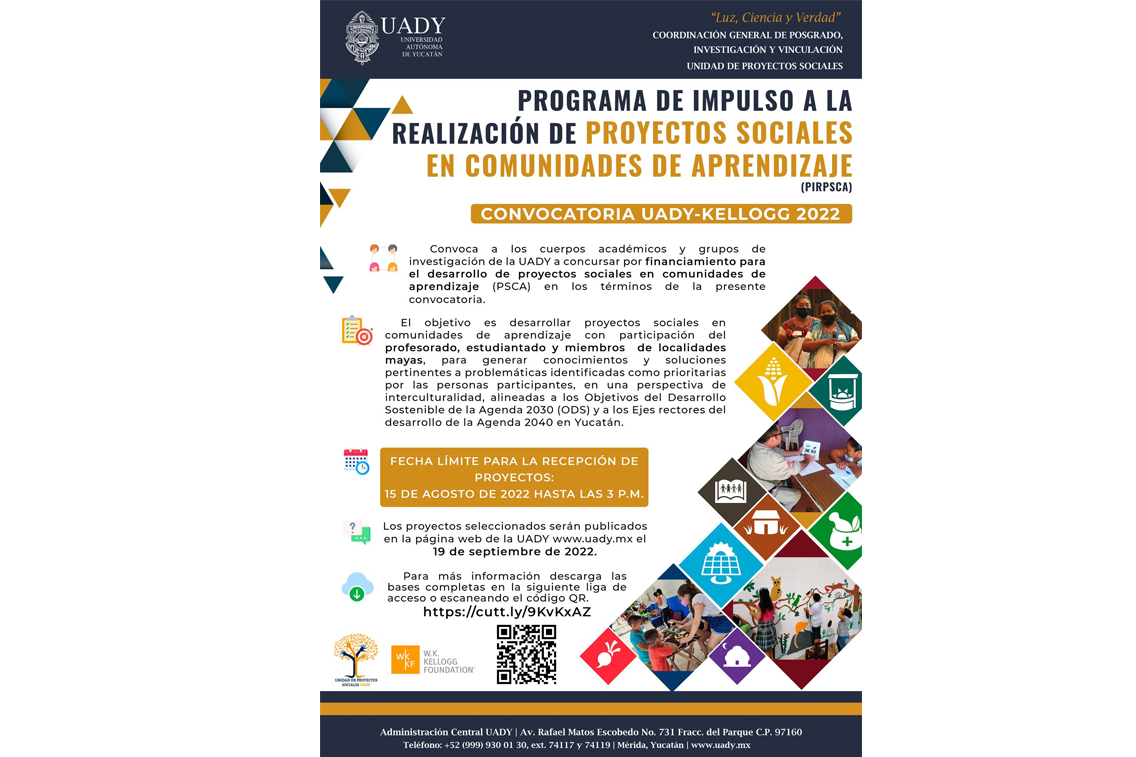 Cuerpos académicos y grupos de investigación de la Universidad Autónoma de Yucatán (UADY) podrán concursar por financiamiento para el desarrollo de Proyectos Sociales en Comunidades de Aprendizaje (PSCA), a través de la Convocatoria UADY-Kellog 2022.
