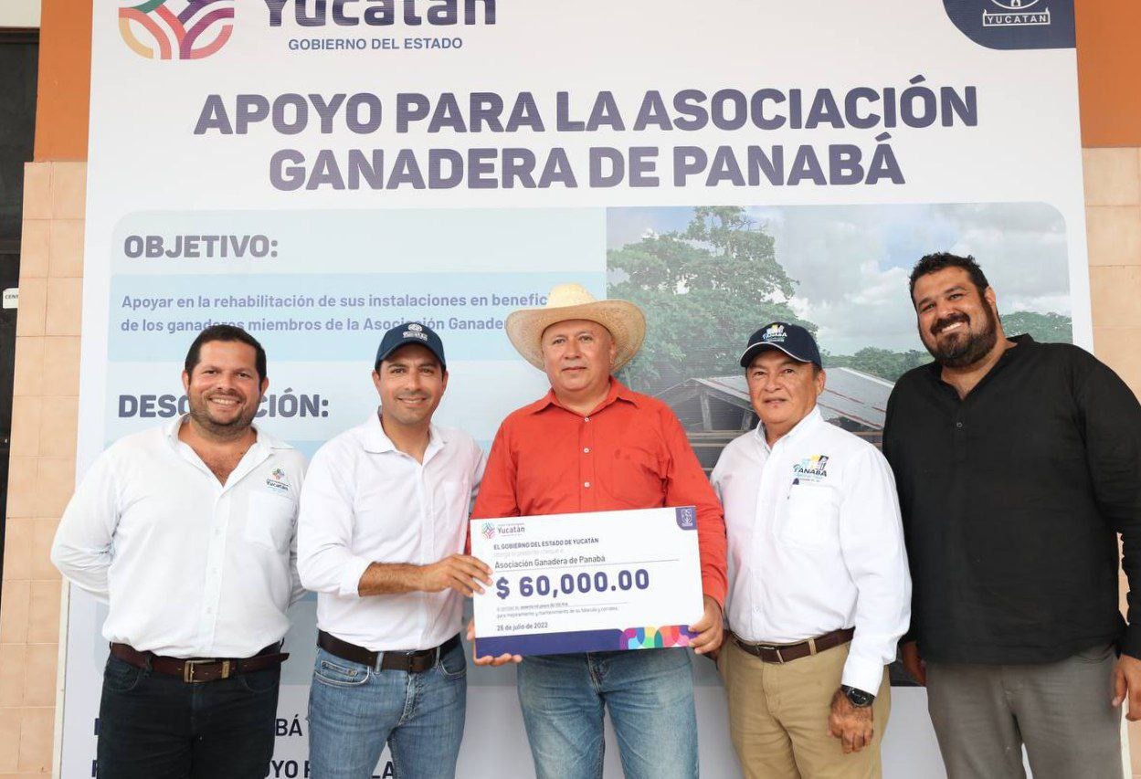 Ahí, el Gobernador entregó un apoyo económico por 60 mil pesos a la Asociación Ganadera de Panabá, para la rehabilitación de sus instalaciones en beneficio de 420 ganaderos miembros locales, con lo que podrán hacer mejoras en su báscula de pesaje, así como los espacios y corrales a fin de mantener la seguridad de las personas que ahí laboran, así como de los propios animales.