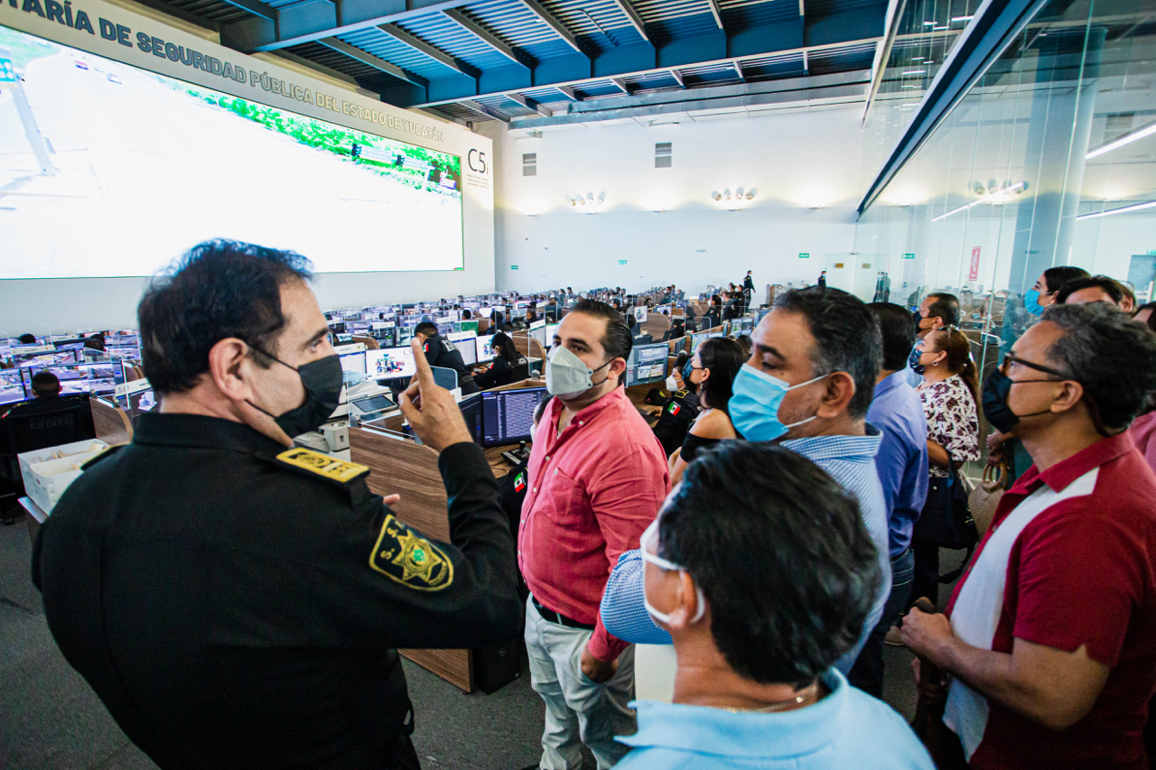 Un nutrido grupo de empresarios afiliados a la Asociación de Restaurantes de Valladolid ARVAY A.C., acudió a las instalaciones del C5i recientemente inaugurado para constatar el equipamiento tecnológico de vigilancia, como parte de la estrategia Yucatán Seguro. La visita guiada corrió a cargo del Secretario de Seguridad Pública, Luis Felipe Saidén Ojeda.