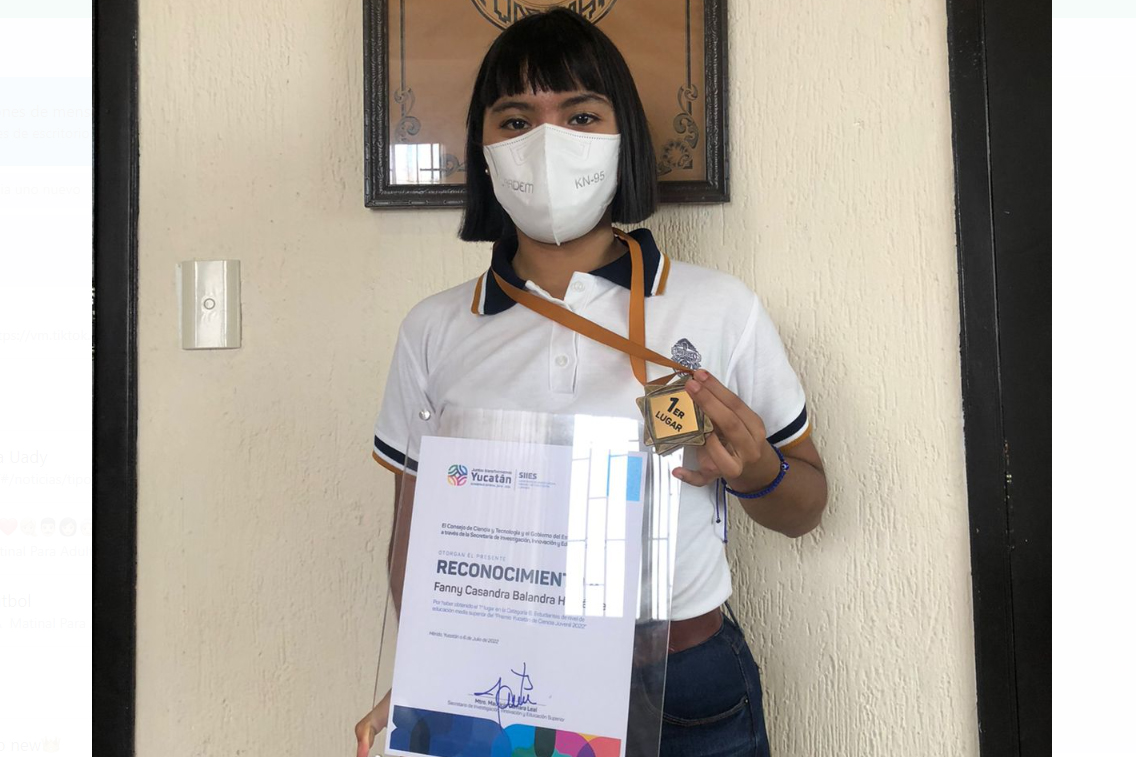 La estudiante recién egresada de la Escuela Preparatoria Uno de la Universidad Autónoma de Yucatán (UADY), Fanny Balandra Hernández, obtuvo el primer lugar en la Categoría B de estudiantes de Educación Media Superior en la convocatoria “Premio Yucatán de Ciencia Juvenil 2022”.