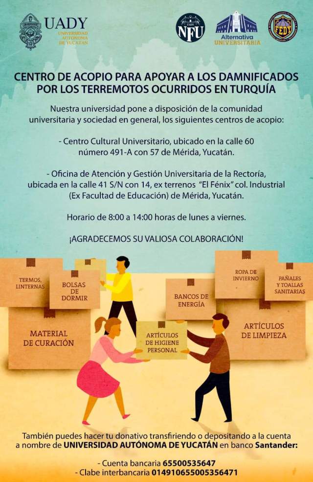 La Universidad Autónoma de Yucatán (UADY) pone a disposición de la comunidad universitaria y sociedad en general, dos centros de acopio de artículos de primera necesidad que serán enviados para apoyar a las personas damnificadas por los terremotos ocurridos en Turquía.